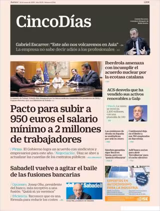 CINCO DÍAS: "Pacto para subir a 950 euros el salario mínimo a 2 millones de trabajadores"; "Sabadell vuelve a agitar el baile de las fusiones bancarias"; "Iberdrola amenaza con incumplir el acuerdo nuclear por la ecotasa catalana".