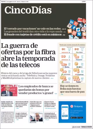 CINCO DÍAS: "La guerra de ofertas por la fibra abre la temporada de las telecos"; "Hay acciones en Bolsa más baratas que una barra de pan"; "Los empleados de banca se quedarán sin bonus por vender productos 'a granel'".