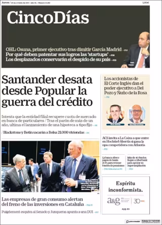 CINCO DÍAS: "Santander desata desde Popular la guerra del crédito"; "Los accionistas de El Corte Inglés dan el poder ejecutivo a Del Pozo y Nuño de la Rosa"; "Las empresas de gran consumo alertan del freno de las inversiones en Cataluña"; "ACS invita a La Caixa a que entre en Hochtief-Abertis si gana la opa competidora con Atlantia".