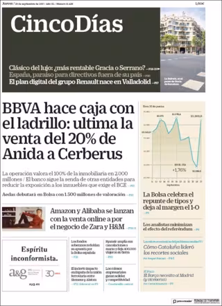 CINCO DÍAS: "BBVA hace caja con el ladrillo: ultima la venta del 20% de Anida de Cerberus"; "Amazon y Alibaba se lanzan en la venta online a por el negocio de Zara y H&M"; "La bolsa celebra el repunte de tipos y deja al margen el 1-O".