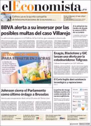 EL ECONOMISTA: "BBVA alerta a su inversor por las posibles multas del caso Villarejo"; "Enagás, Blackstone y GIC lanzan una oferta por la estadounidense Tallgrass"; "Johnson cierra el Parlamento como último órdago a Bruselas".
