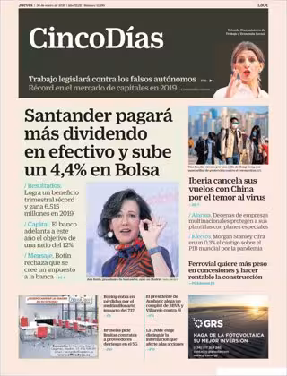 CINCO DÍAS: "Santander pagará más dividendo en efectivo y sube un 4,4% en Bolsa"; "Iberia cancela sus vuelos con China por el temor al virus"; "Ferrovial quiere más peso en concesiones y hacer rentable la construcción".