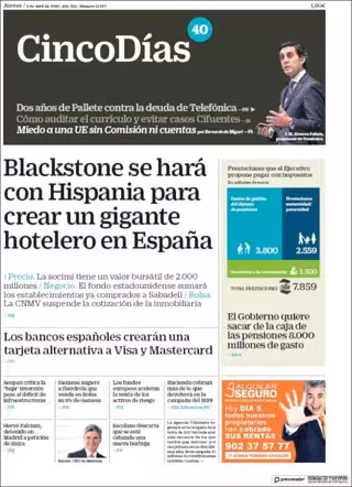 CINCO DÍAS: "Blackstone se hará con Hispania para crear un gigante hotelero en España"; "Los bancos españoles crearán una tarjeta alternativa a Visa y Mastercard"; "El Gobierno quiere sacar de la caja de las pensiones 8.000 millones de gasto".