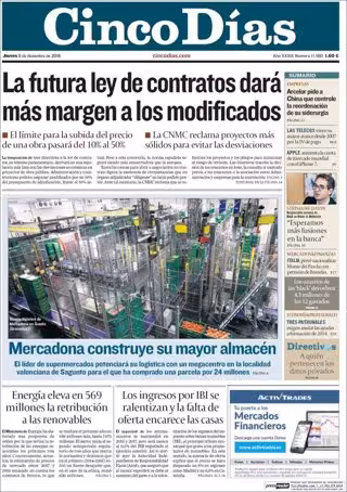 CINCO DÍAS: "La futura ley de contratos dará más margen a los modificados"; "Mercadona construye su mayor almacén"; "Energía eleva en 569 millones la retribución a las renovables"; Los ingresos por IBI se ralentizan y la falta de oferta encarece las casas"; "Arcelor pide a China que controle la reordenación de su siderurgia".