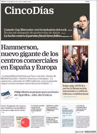 CINCO DÍAS: "Hammerson, nuevo gigante de los centros comerciales en España y Europa"; "Rajoy urge al PSOE a pactar la financiación autonómica y enfría la reforma constitucional"; "Philip Morris se prepara para un futuro sin cigarrillos... salvo electrónicos".