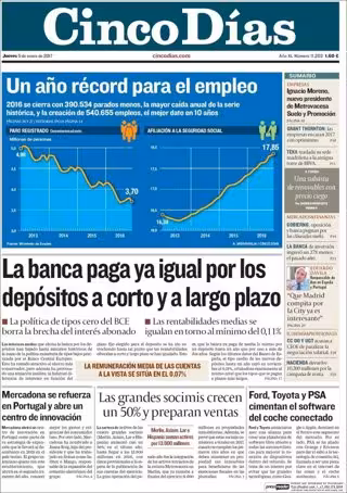 CINCO DÍAS: "Un año récord para el empleo"; "La banca paga ya igual por los depósitos a corto y a largo plazo"; "Mercadona se refuerza en Portugal y abre un centro de investigación"; "Las grandes socimis crecen un 50% y preparan ventas"; "Ford, Toyoya y PSA cimentan el software del coche eléctrico".