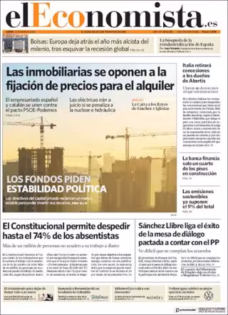 EL ECONOMISTA: "Las inmobiliarias se oponen a las fijación de precios para el alquiler"; "Italia retirará concesiones a los dueños de Abertis"; "El Constitucional permite despedir hasta el 74% de los absentistas".