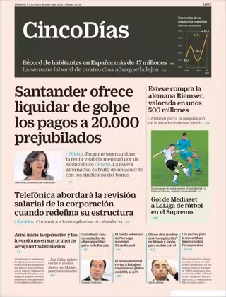 CINCO DÍAS: "Santander ofrece liquidar de golpe los pagos a 20.000 prejubilados"; "Telefónica abordará la revisión salarial de la corporación cuando redefina su estructura".