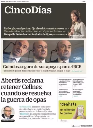 CINCO DÍAS: "Abertis reclama retener Cellnex cuando se resuelva la guerra de opas"; "Guindos, seguro de sus apoyos para el BCE"; "En Google, un algoritmo fija el sueldo sin mirar sexos".