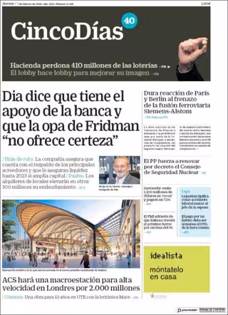 CINCO DÍAS: "Dia dice que tiene el apoyo de la banca y que la opa de Fridman 'no ofrece certeza'"; "ACS hará una macroestación para alta velocidad en Londres por 2.000 millones"; "Dura reacción de París y Berlín al frenazo de la fusión ferroviaria Siemens-Alstom".