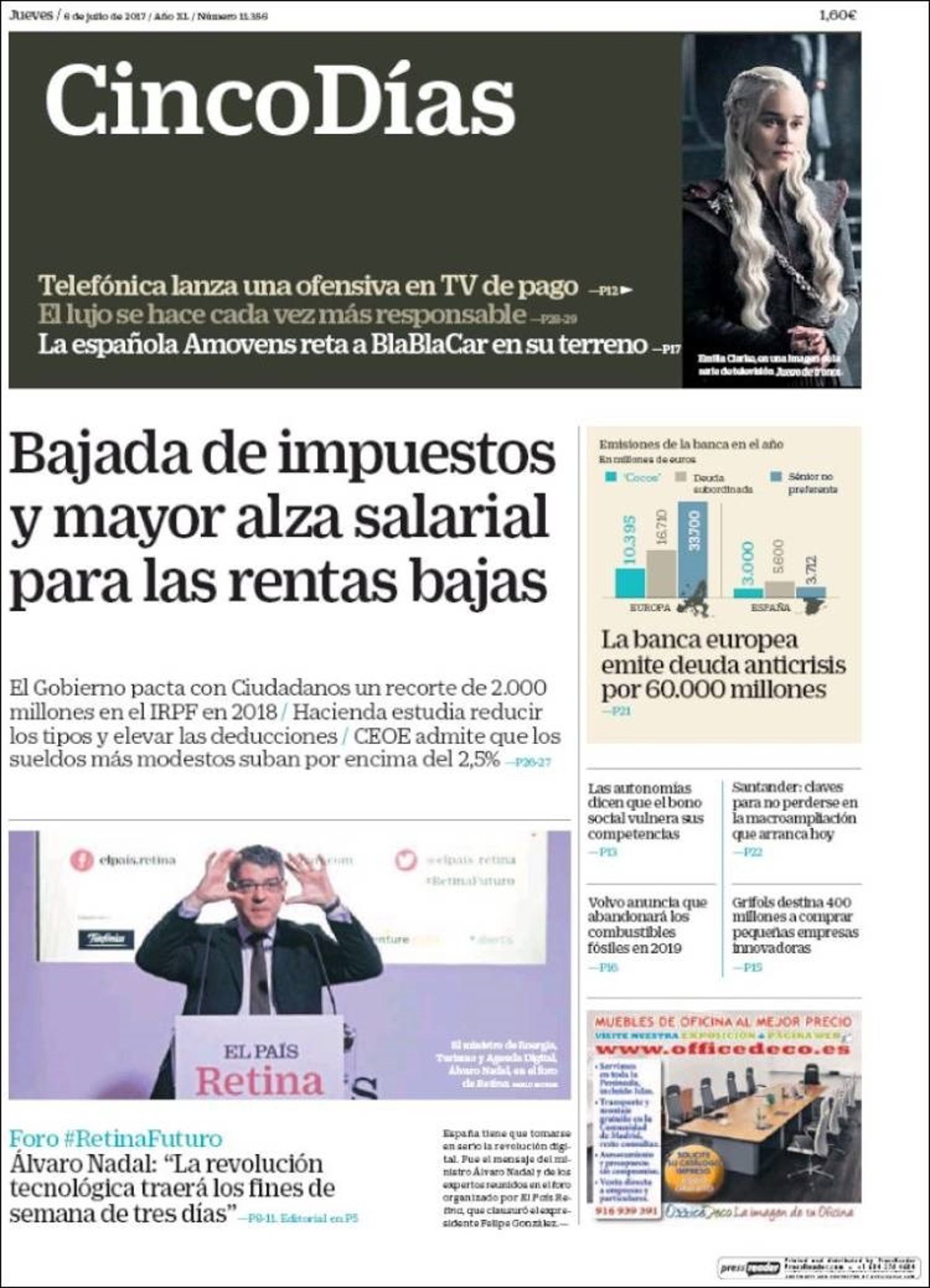 CINCO DÍAS: "Bajada de impuestos y mayor alza salarial para las rentas bajas"; "La banca europea emite deuda anticrisis por 60.000 millones"; "Las autonomías dicen que el bono social vulnera sus competencias".
