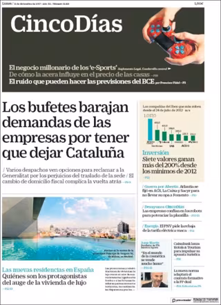 CINCO DÍAS: "Los bufetes barajan demandas de las empresas por tener que dejar Cataluña"; "Siete valores ganan más del 200% desde los mínimos de 2012"; "Quiénes son los protagonistas del auge de la vivienda de lujo".
