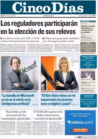 CINCO DÍAS: "Los reguladores participarán en la elección de sus relevos"; Entrevista al vicepresidente de Microsoft Advertising: "La batalla de Microsoft ya no es e móvil, es la inteligencia artificial"; Entrevista a la consejera delegada de Penguin Random House: "El libro físico tiene un rol importante: los jóvenes leen en digital y papel"; "Hacienda acude al rescate de los municipios quebrados"; "El MAB abre paso en la Bolsa a las nuevas "socimis en desarrollo".