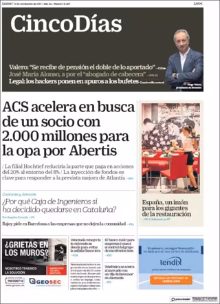 CINCO DÍAS: "ACS acelera en busca de un socio con 2.000 millones para la opa por Abertis"; "España, un imán para los gigantes de la restauración"; "¿Por qué Caja de Ingenieros sí ha decidido quedarse en Cataluña?".
