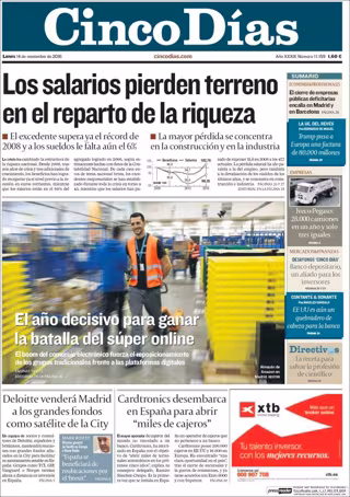 CINCO DÍAS: "Los salarios pierden terreno en el reparto de la riqueza"; "El año decisivo para ganar la batalla del súper online"; "Deloitte venderá Madrid a los grandes fondos como satéite de la City"; "Cardtronics desembarca en España para abrir miles de cajeros"; "El cierre de empresas públicas deficitarias encalla en Madrid y Barcelona".