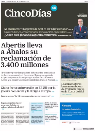 CINCO DÍAS: "Abertis lleva a Ábalos su reclamación de 3.400 millones"; "Las promotoras buscan un boom de vivienda nueva en la Costa del Sol"; "China frena su inversión en EE UU por la guerra comercial y la dirige a Europa"; "España registra el peor arranque del año en salidas a Bolsa desde 2013".