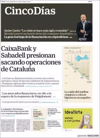 CINCO DÍAS: "CaixaBank y Sabadell presionan sacando operaciones de Cataluña"; "Los mercados financieros, en vilo a la espera de la respuesta de Puigdemont"; "La caída del euríbor empieza a colocar hipotecas en negativo"; "Los gigantes del turismo en la red depredan el mercado con compras multitudinarias".