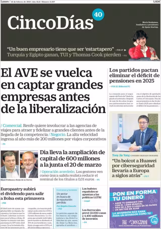 CINCO DÍAS: "El AVE se vuelca en captar grandes empresas antes de la liberalización"; "Los partidos pactan eliminar el déficit de pensiones en 2025"; "Dia lleva la ampliación de capital de 600 millones a la junta el 20 de marzo".