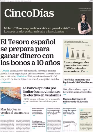 CINCO DÍAS: "El Tesoro español se prepara para ganar dinero con los bonos a 10 años"; "Las cuatro grandes promotoras suman 11.000 viviendas en construcción"; "La banca apuesta por limitar los movimientos de efectivo en ventanilla".