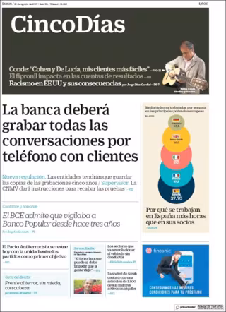 CINCO DÍAS: "La banca deberá grabar todas las conversaciones por teléfono con clientes"; "Por qué se trabajan en España más horas que en sus socios?"; "El BCE admite que vigilaba a Banco Popular desde hace tres años"; "El Pacto Antiterrorista se reúne hoy con la unidad entre los partidos como primer objetivo".