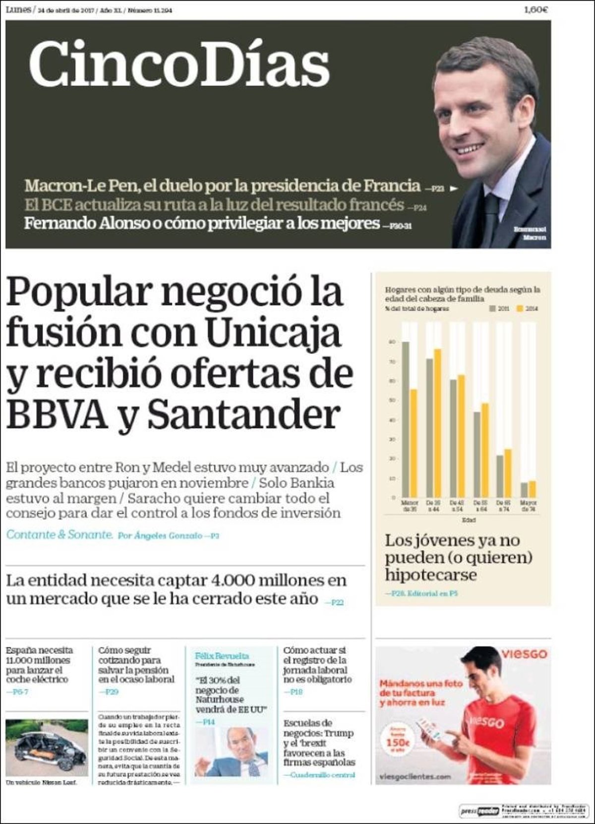 CINCO DÍAS: "Macron-Le Pen, el duelo por la presidencia de Francia"; "El BCE actualiza su ruta a la luz del resultado francés"; "Fernando Alonso o cómo privilegiar a los mejores"; "Popular negoció la fusión con Unicaja y recibió ofertas de BBVA y Santander"; "Los jóvenes ya no pueden (o quieren) hipotecarse".