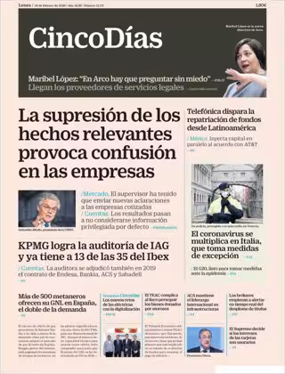 CINCO DÍAS: "La supresión de los hechos relevantes provoca confusión en las empresas"; "Telefónica dispara la repatriación de fondos desde Latinoamérica"; "KPMG logra la auditoría de IAG y ya tiene a 13 de las 35 del Ibex".