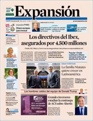 EXPANSIÓN: "Los directivos del Ibex, asegurados por 4.500 millones"; "La familia Matutes quiere crecer en Latinoamérica"; "Grandes inversores estudian la contraopa de ACS sobre Abertis".