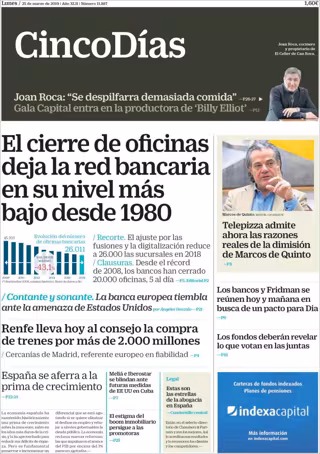 CINCO DÍAS: "El cierre de oficinas deja la red bancaria en su nivel más bajo desde 1980"; "Telepizza admite ahora las razones reales de la dimisión de Marcos de Quinto"; "Renfe lleva hoy al consejo la compra de trenes por más de 2.000 millones".