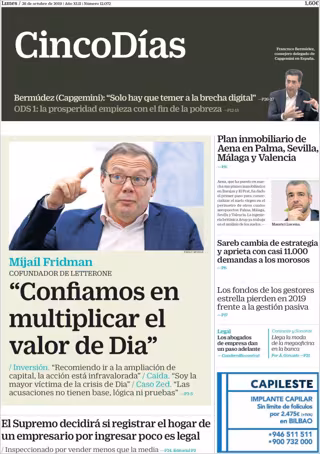 CINCO DÍAS: El cofundador de Letterone, Mijaíl Fridman: "Confiamos en multiplicar el valor de Dia"; "Plan inmobiliario de Aena en Palma, Sevilla, Málaga y Valencia"; "Sareb cambia de estrategia y aprieta con casi 11.000 demandas a los morosos".