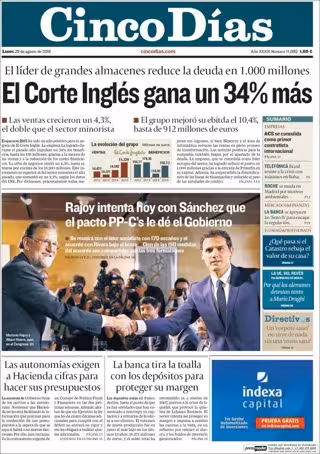 CINCO DÍAS: "El Corte Inglés gana un 34% más"; "Rajoy intenta hoy con Sánchez que el pacto PP-C's le dé el Gobierno"; "Las autonomías exigen a Hacienda cifras para hacer sus presupuestos"; "La banca tira la toalla con los depósitos para proteger su margen"; "ACS se consolida como primer internacional".