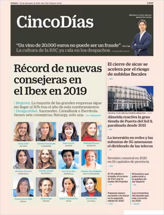 CINCO DÍAS: "Récord de nuevas consejeras en el Ibex en 2019"; "El cierre de sicav se acelera por el riesgo de subidas fiscales"; "Almeida reactiva la gran tienda de Puerta del Sol 9, paralizada desde 2015".