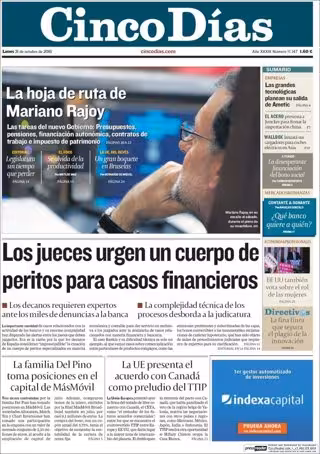 CINCO DÍAS: "La hoja de ruta de Mariano Rajoy"; "Los jueces urgen un cuerpo de peritos para casos financieros"; "La familia Del Pino toma posiciones en el capital de Más Móvil"; "La UE presenta el acuerdo con Canadá como preludio del TTIP"; "Las grandes tecnológicas planean su salida de Ametic".
