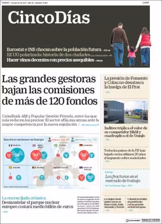CINCO DÍAS: "Las grandes gestoras bajan las comisiones de más de 120 fondos"; "La presión de Fomento y Colau no desatasca la huelga de El Prat"; "Inditex triplica el valor de su competidor H&M y cuadruplica el de Uniqlo"; "Desmantelar el parque nuclear europeo costará medio billón de euros".