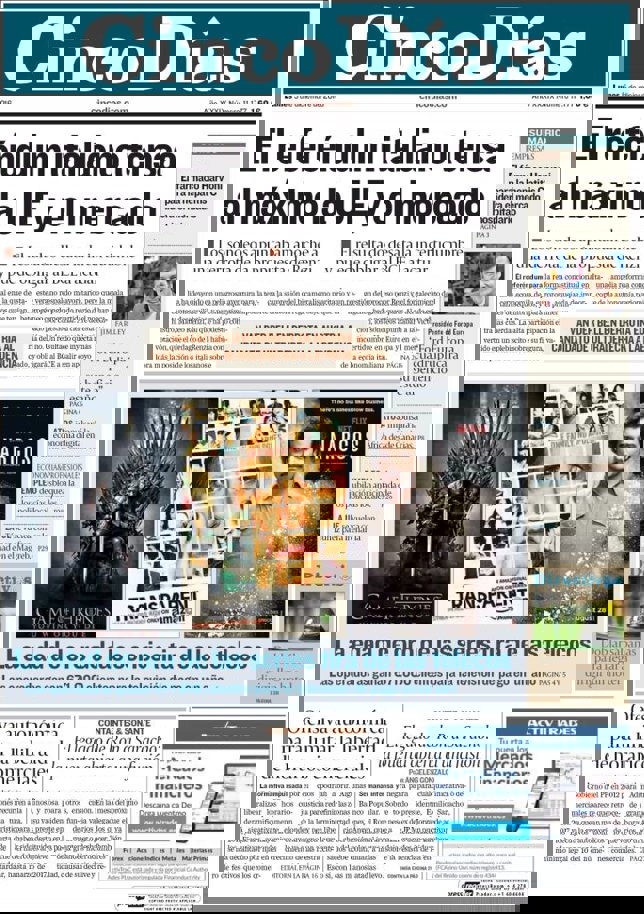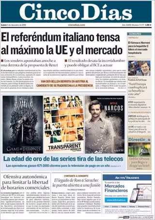 CINCO DÍAS: "El referéndum italiano tensa al máximo la UE y el mercado"; "La edad de oro de las series tira de las telecos"; "Ofensiva autonómica para limitar la libertad de horarios comerciales"; "El legado de Ron a Saracho: la puerta abierta a una fusión".