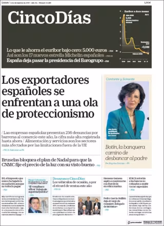 CINCO DÍAS: "Los exportadores españoles se enfrentan a una ola de proteccionismo"; "Bruselas bloquea el plan de Nadal para que la CNMC fije el precio de la luz con su visto bueno"; "Botín, la banquera camino de desbancar al padre".