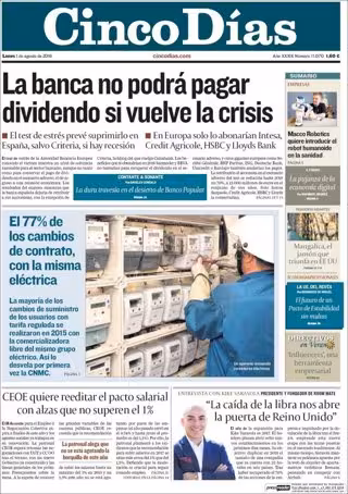 CINCO DÍAS: "La banca no podrá pagar dividendo si vuelve la crisis"; "El 77% de los cambios de contrato, con la misma eléctrica"; "CEOE quiere reeditar el pacto salarial con alzas que no superen el 1%"; "La caída de la libra nos abre la puerta de Reino Unido"; "Macco Robotics quiere introducir el robot humanoide en la sanidad".