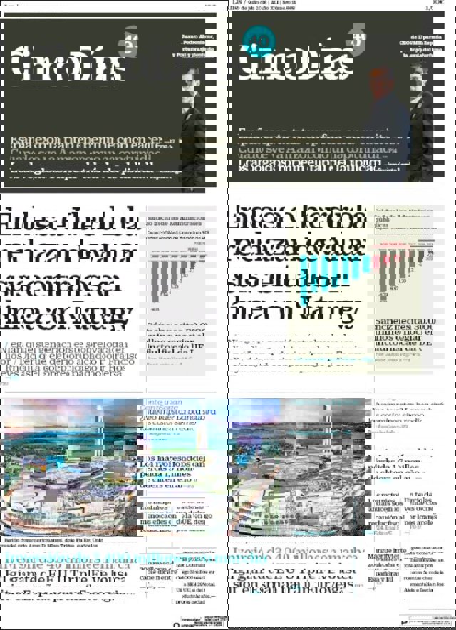 CINCO DÍAS: "Endesa e Iberdrola rechazan devaluar sus centrales en línea con Naturgy"; "Sánchez necesita 30.000 millones o negociar el indulto fiscal de la UE"; "El gigante de EEUU Triple Five busca sitio en España para un 'Eurovegas'".