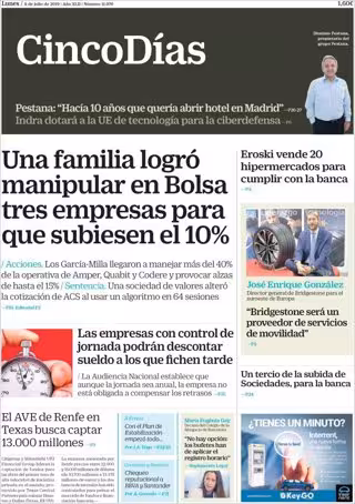 CINCO DÍAS: "Una familia logró manipular en Bolsa tres empresas para que subiesen el 10%"; "Las empresas con control de jornada podrán descontar sueldo a los que fichen tarde"; "El AVE de Renfe en Texas busca captar 13.000 millones".