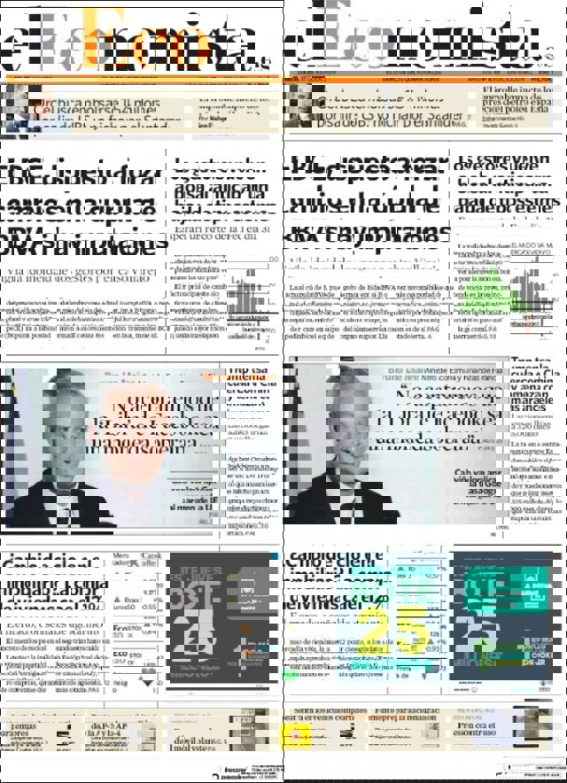 Las primeras ediciones de los periódicos de información económica españoles incluyen, entre otras, las siguientes noticias en sus portadas: