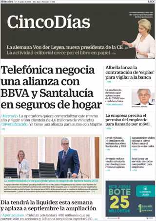 CINCO DÍAS: "Telefónica negocia una alianza con BBVA y Santalucía en seguros de hogar"; "Albella lanza la contratación de 'espías' para vigilar a la banca"; "Dia tendrá la liquidez esta semana y aplaza a septiembre la ampliación".