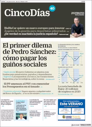 CINCO DÍAS: "El primer dilema de Pedro Sánchez: cómo pagar los guiños sociales"; "Los expertos proponen un IRPF que no dispare el tipo marginal"; "La petición de una subida salarial del 16% tensiona la hostelería"; "El Corte Inglés: por qué Gimeno da el sí a unas cuentas en las que no cree".