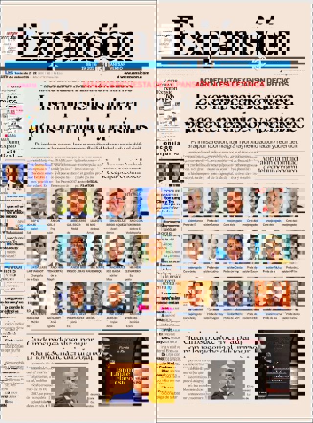 EXPANSIÓN: "Los empresarios quieren pactos en empleo y pensiones"; "Valoran la continuidad del equipo económico"; "Guindos puede volver a pujar por la presidencia del Eurogrupo"; "Clinton y Trump pelean por el voto de los indecisos.