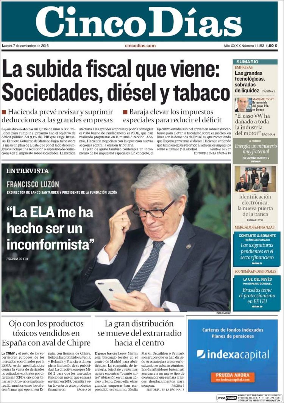 CINCO DÍAS: "La subida fiscal que viene: Sociedades, diésel y tabaco"; Entrevista al exdirector de Banco Santander, Francisco Luzón: "La ELA me ha hecho ser un inconformista"; "Ojo con los productos tóxicos vendidos en España con aval de Chipre"; "La gran distribución se mueve del extrarradio hacia el centro"; "Las grandes tecnológicas, sobradas de liquidez".