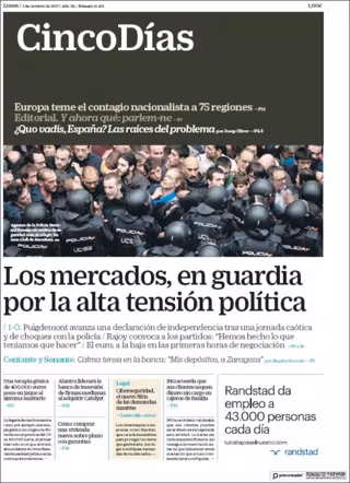 CINCO DÍAS: "Los mercados, en guardia por la alta tensión política"; "Europa teme el contagio nacionalista a 75 regiones"; "Una tarjeta genérica de 400.000 euros pone en jaque al sistema sanitario".