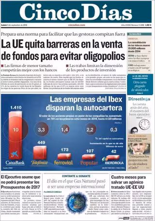 CINCO DÍAS: "La UE quita barreras en la venta de fondos para evitar oligopolios"; "Las empresas del Ibex disparan la autocartera"; "El ejecutivo asume que no podrá presentar los Presupuestos de 2017"; "El día en que Gas Natural pasó a ser una empresa internacional"; "Cuatro meses para salvar un agónico tratado UE - EEUU"; "La consolidación de las telecos mueve 19.000 millones desde 2014".