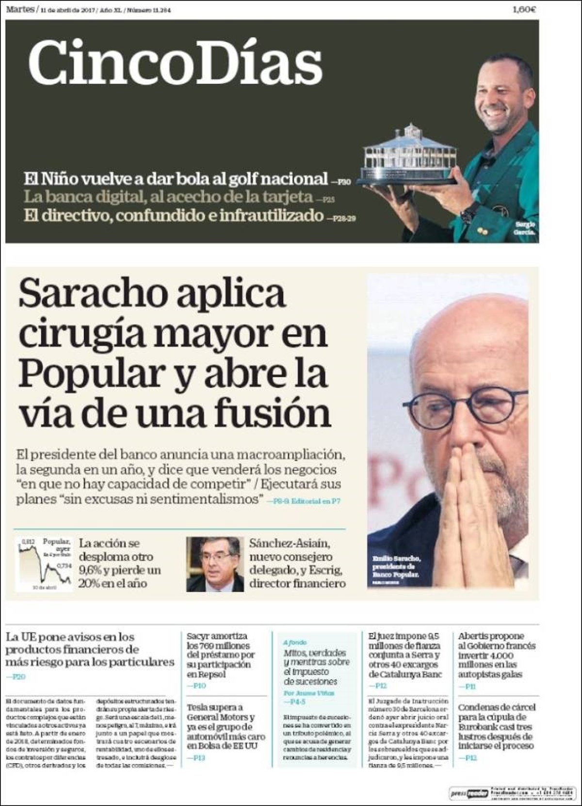 CINCO DÍAS: "Saracho aplica cirugía mayor en Popular y abre la vía de una fusión"; "La UE pone avisos en los productos financieros de más riesgo para los particulares"; "Sacyr amortiza los 769 millones del préstamo por su participación en Repsol"; "Tesla supera a General Motors y ya es el grupo de automóvil más caro en Bolsa de EEUU".