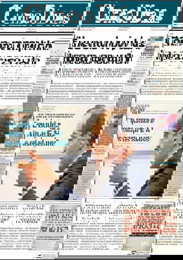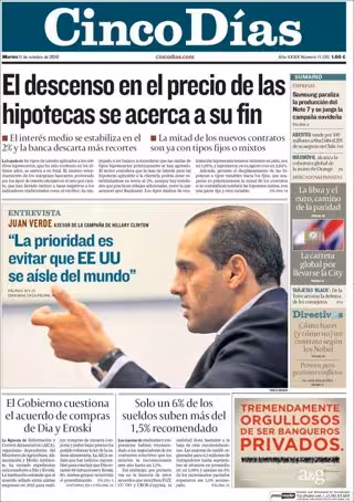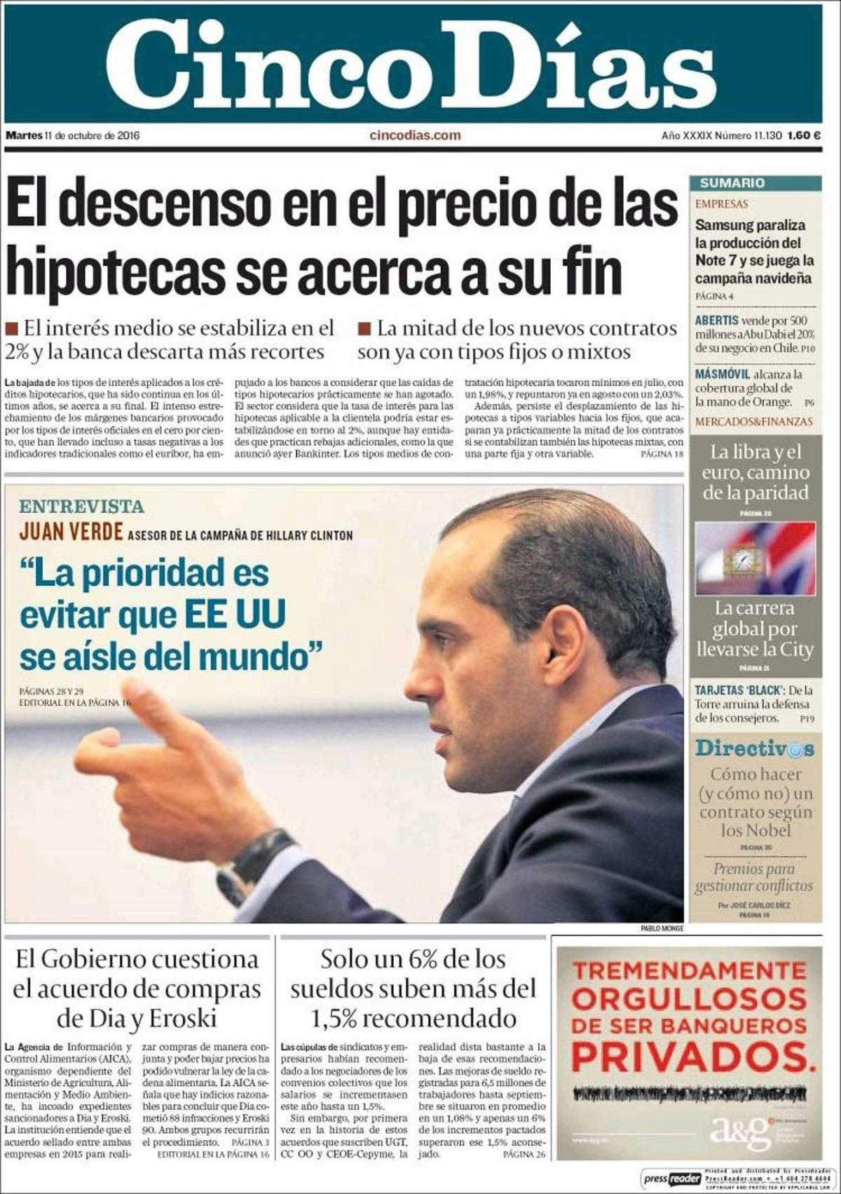 CINCO DÍAS: "El descenso en el precio de las hipotecas se acerca a su fin"; Entrevista al asesor de campaña de Hillary Clinton, Juan Verde: "La prioridad es evitar que EEUU se aísle del mundo"; "El Gobierno cuestiona el acuerdo de compras de Dia y Eroski"; "Solo el 6% de los sueldos suben más del 1,5% recomendado".