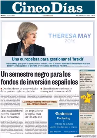 CINCO DÍAS: "Una europeísta para gestionar el Brexit"; "Un semestre negro para los fondos de inversión españoles"; "La inspección laboral estrecha el control de las horas extras"; "Las ampliaciones de capital caen un 42% este año"; "Las aerolíneas piden aeropuertos más ágiles para evitar más crisis".