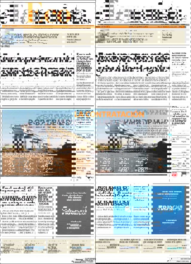 EL ECONOMISTA: "Moncloa pone ahora en duda igualar el diésel a la gasolina"; "La contratación de obras sube un 5%"; "Repsol reparte el 6,6% de dividendo, 80 puntos por encima de su sector"; "Bankia y Aena se juegan un pago extra en las elecciones";" Endesa nombra a Sánchez-Calero presidente y da el poder a Bogas".
