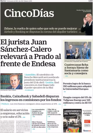 CINCO DÍAS: "El jurista Juan Sánchez-Calero relevará a Prado al frente de Endesa"; "Cuatrecasas ficha a Soraya Sáenz de Santamaría como socia y consejera"; "Bankia, CaixaBank y Sabadell disparan los ingresos en comisiones por los fondos".